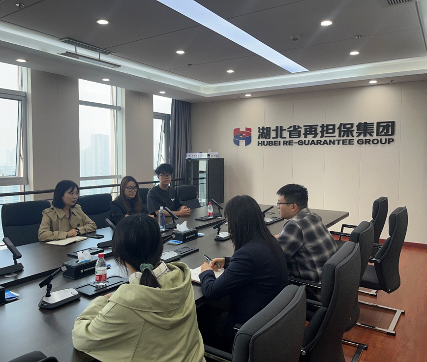 (通讯员 马鑫宇)为进一步规范和加强金融硕士研究生培养工作,有效推进校企合作,切实提升人才培养质量。10月28日,学院金融硕士教育中心副主任田嘉莉赴我校省级研究生工作站——湖北省再担保集团走访调研,并慰问正在实习的金融硕士研究生。湖北省再担保集团人力资源部总经理文璐、薪酬考核经理邓睿斌、招聘人事经理陈念念,以及正在湖北省再担保集团实习的5名2023级金融硕士研究生参加座谈。