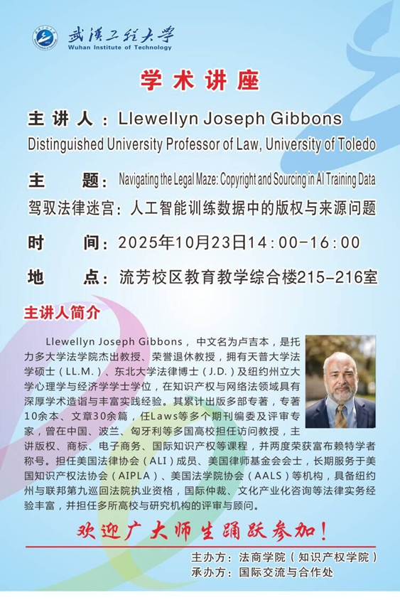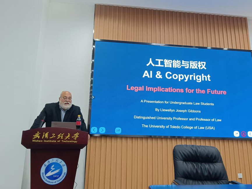 Llewellyn Joseph Gibbons教授现任托力多大学法学院杰出教授、荣誉退休教授,拥有天普大学法学硕士、东北大学法律博士学位,长期从事版权、商标、网络法及国际知识产权教学、研究与法律实务。据不完全统计,其累计出版专著10余部、学术论文30余篇,并担任美国法律协会(ALI)成员、美国律师基金会会士及多家期刊编委。他曾多次来华讲学,两度荣获富布赖特学者称号,并受聘为中南财经政法大学“文澜学者”讲座教授。其丰富的跨国教学、仲裁及文化产业咨询经验,使此次讲座兼具国际视野与本土关怀,为武汉工程大学知识产权学科师生带来了一场思想盛宴。