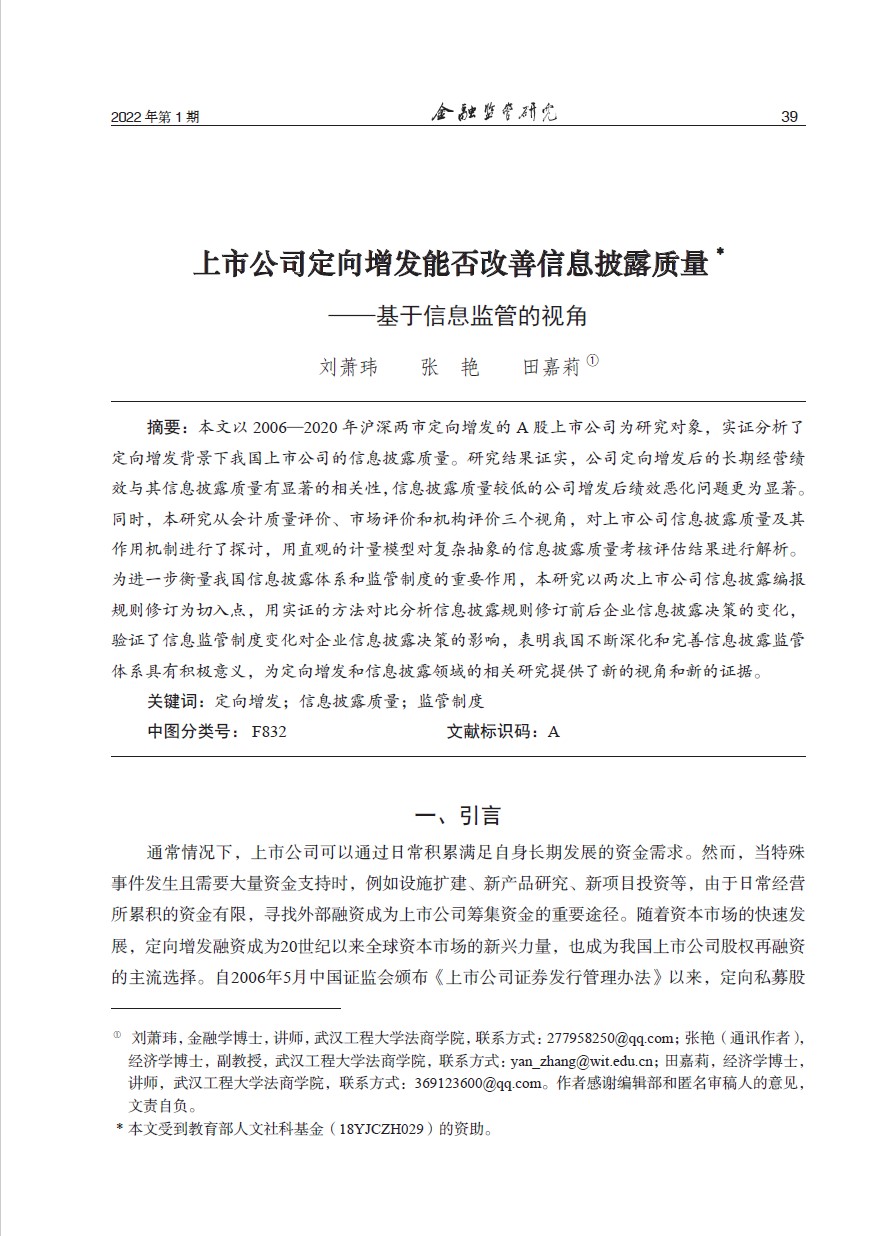 (通讯员 刘萧玮)近日,我校suncitygroup太阳集团教师青年教师刘萧玮、张艳和田嘉莉共同合作论文在《金融监管研究》2022年第1期发表,题目为“上市公司定向增发能否改善信息披露质量——基于信息监管的视角”。该刊是由原中国银监会创办发行的专业学术期刊,是中文社会科学引文索引(CSSCI)扩展版来源期刊,主要刊发金融监管、风险管理与金融改革发展等领域的理论研究和政策研究等方面相关的成果。