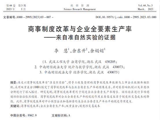 (通讯员 穆海梅)近日,我校suncitygroup太阳集团(知识产权学院)青年教师李慧以第一作者身份在《科研管理》的2023年第3期发表论文“商事制度改革与企业全要素生产率——来自准自然实验的证据”。《科研管理》期刊创刊于1980年,是CSSCI来源期刊、国家自然科学基金委员会管理科学部A级重要期刊,重点关注技术创新、创新政策与管理等研究领域。