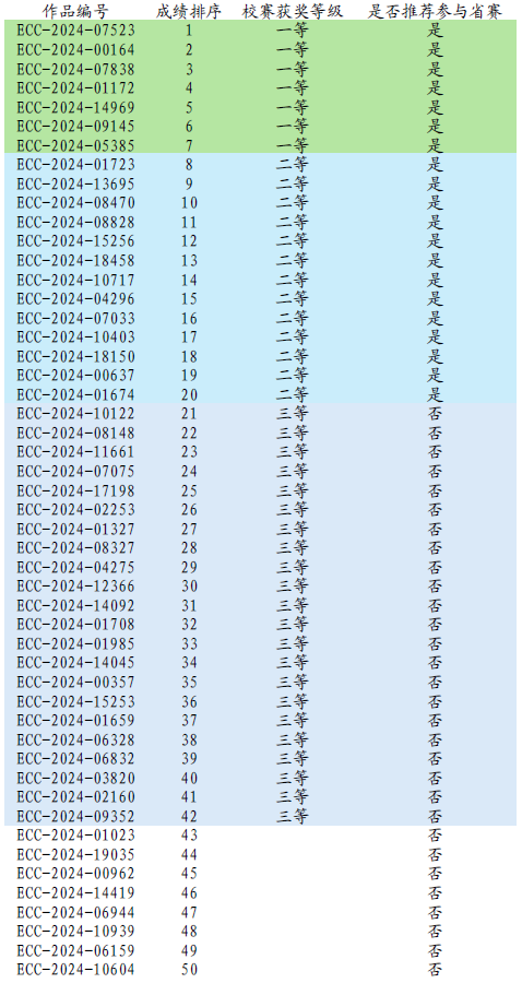 根据湖北赛区组委会要求,校赛组委会结合本校作品数量和类型,依据校赛队伍作品综合评审得分,前15%作品荣获校赛一等奖,16%~40%之间作品荣获校赛二等奖,其余参加答辩作品获三等奖。同时按照湖北赛区组委会要求,校赛一等奖和二等奖作品,合计40%校赛作品比例,按照评审得分排序,推荐入围省赛角逐。本次校赛获奖名单及省赛推荐名单见附件。