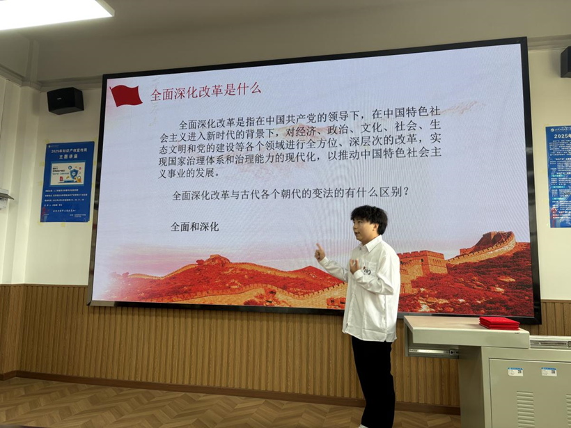 研究生法学第一党支部的张尚辉同志以《全面深化改革——从国家到个人》为题,将国家宏观战略与青年个体的成长发展紧密结合,阐述了全面深化改革的重大意义,并探讨了青年学子如何在改革浪潮中找准定位、贡献力量。