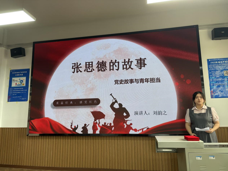 本科生第一党支部的刘韵之同志以《永不褪色的旗帜:张思德与为人民服务的初心》为题,深情讲述了张思德同志的光辉事迹,深刻阐释了“为人民服务”根本宗旨的永恒价值,展现了共产党人的崇高精神境界。