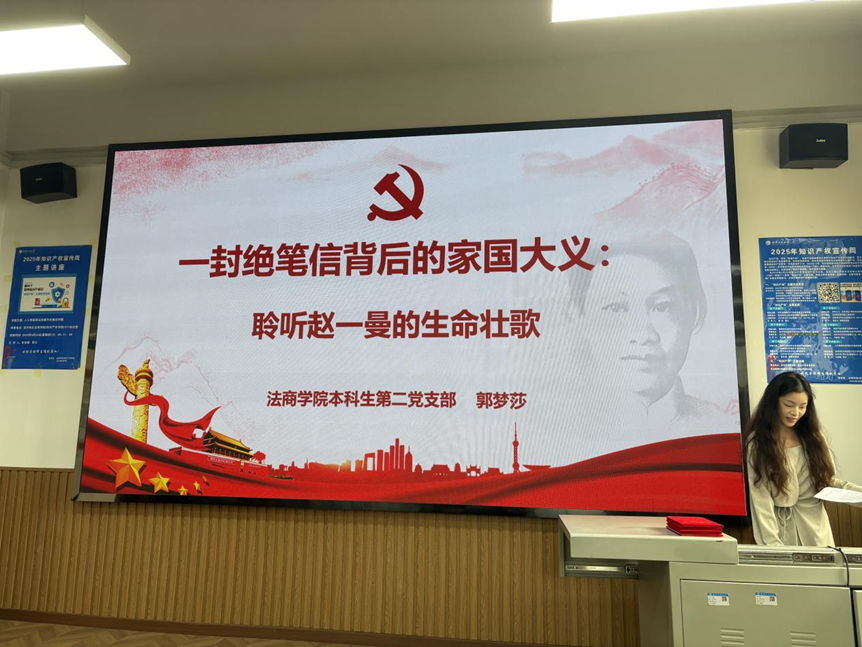 本科生第二党支部的郭梦莎同志分享了《一封绝笔信背后的家国大义:聆听赵一曼的生命壮歌》。她以抗日英雄赵一曼烈士感人的绝笔信为引,生动还原了其英勇无畏的革命历程和深厚的家国情怀,深深打动了在场的每一位听众。