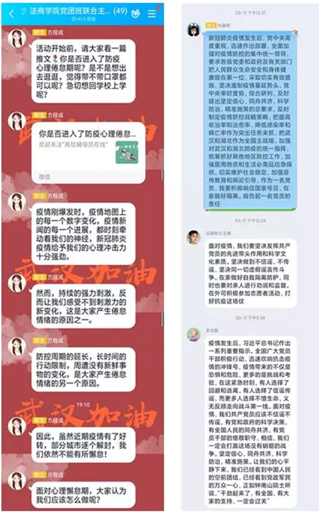 为深入学习贯彻习近平总书记关于打赢疫情防控阻击战的重要指示精神,充分发挥党组织的战斗堡垒作用和党员的先锋模范作用,连日来,武汉工程大学suncitygroup太阳集团各党支部用“互联网+”思维纵深拓展党建工作,通过学“习”语、悟“习”言、践“习”示,运用打造“云课堂”、开展“微党课”、投身“主战场”等形式开展党班团共建线上系列主题党日活动,共话感悟、共促学习、共叙深情,坚定战胜疫情的信心。
