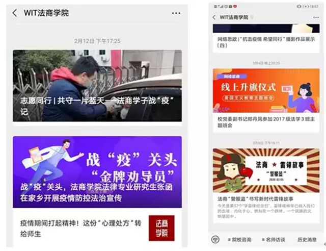 学院党委结合疫情实际创新开展主题“云党日”活动,以党员“微论坛”、支部书记“微党课”,共建支部大家讲等方式,利用“微媒体”载体,打造“云+主题党日”新阵地。将高校思想政治理论课教学优势转化为支持防疫斗争的强大力量,引导广大学生增强“四个意识”、坚定“四个自信”、做到“两个维护”,坚定在以习近平同志为核心的党中央坚强领导下打赢这场疫情防控人民战争、总体战、阻击战的信心和决心,深刻认识中国抗疫彰显的中国共产党领导和中国特色社会主义制度的显著优势。学院通过“微媒体”开展学习《习近平总书记在统筹推进新冠肺炎疫情防控和经济社会发展工作部署会议上的讲话精神》,组织全体学生聆听“全国大学生同上一堂疫情防控思政大课”,组织学生党员和学生干部参加“书记院长‘云接待’——《疫情防控思政课》”活动。