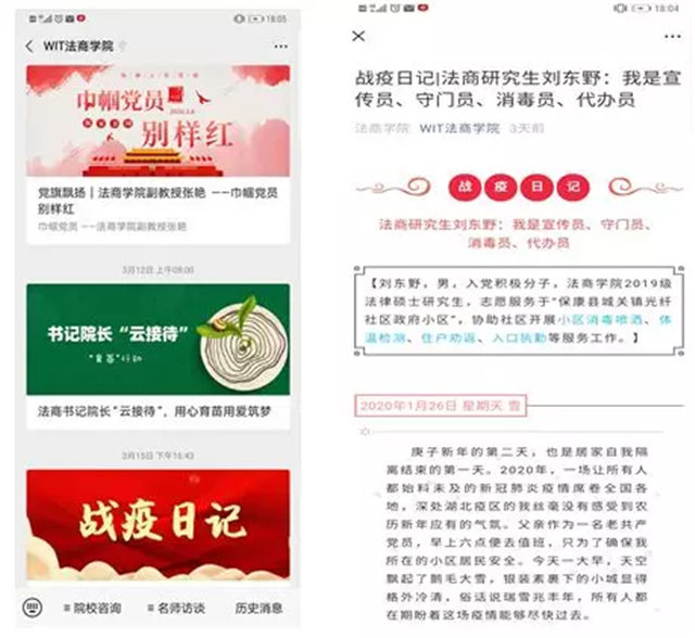 为更好彰显党员、群众抗击疫情的不凡壮举,弘扬校园正能量。学院党委利用“微媒体”,向全体党员宣传我院师生抗疫先锋勇挑重担、迎难而上的感人事迹,弘扬社会正能量,鼓舞斗志,展现全国人民同舟共济的精神风貌,培养党员勇于担当奉献的精神,凝聚众志成城抗疫情的强大力量,全力打赢这场疫情防控阻击战。
