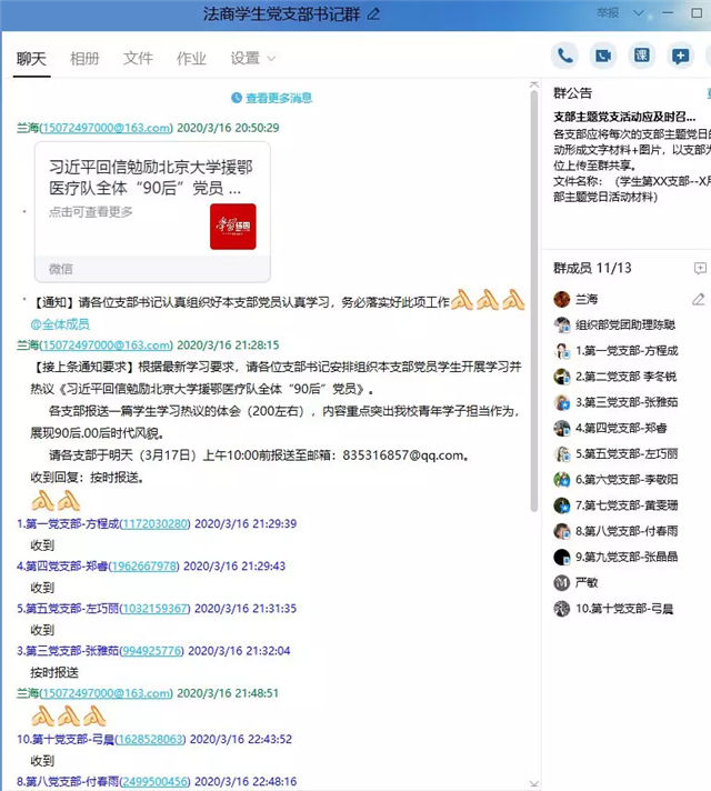 学院党委充分利用“云网络”优势,开展党班团共建“云党日”活动,创新工作方式,筑牢疫情防控堡垒。全体党员进一步提高了对当前疫情防控形势的思想认识,用实际行动践行责任与担当。战“疫”之下,学院党委将继续发挥基层党组织的战斗堡垒作用、广大党员的先锋模范作用,推动各项工作落实落细,让党旗在防控疫情第一线高高飘扬。
