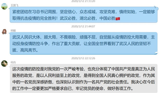 刘姿钰:身处疫情期间,学习完习总书记的回信,做为一名90后大学生党员,我深受启发。每一代人都有其各自的历史机遇,背负着各自的使命,90后的我们已近而立之年,这次突如其来的疫情,让我们不仅学会什么叫责任和担当,更让我们切身体会到什么是家国情怀。中国通过两个月时间从外媒认为“全球最危险的国家”变成了最安全的国家,这离不开党中央的正确领导,离不开全国人民的共同努力。这次抗击疫情也许是给我们90后最好的而立之礼。从一省救一市到如今的一省救一国,我们见证着祖国一步步的强大,感受作为大国的国际担当,内心深处对党和国家是无比的敬佩与自豪。疫情尚未结束,同志仍需努力,一起期待革命的曙光。