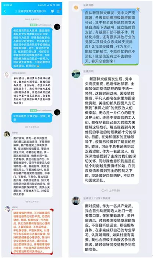 全体党支部“以书桌为战场”,通过线上“微媒体”讨论和线下自主学习相结合的方式展开活动。同学们纷纷表示:“将牢记初心使命,以实际行动担当作为,以更坚定的信心、更扎实的工作,为打赢疫情防控狙击战而奋斗!”