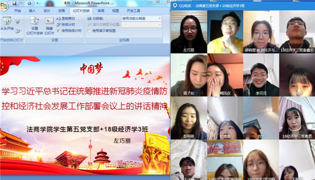“党旗飘扬·共克时艰”党班团共建团队——“学生党员与学生干部”先锋队开展主题党日活动——活动聚焦习近平总书记重要指示精神和党中央决策部署,用科学思想武装头脑,积极引导身边群众正确认识和对待疫情,坚持做好群众思想工作。学院党委书记李志旭、院长金明浩与学生代表视频连线,向学生解读了党中央关于疫情的决策部署,分析了社会主义显著优势,讲述了战“疫”一线的感人故事,深入浅出,令全体师生备受鼓舞和激励。