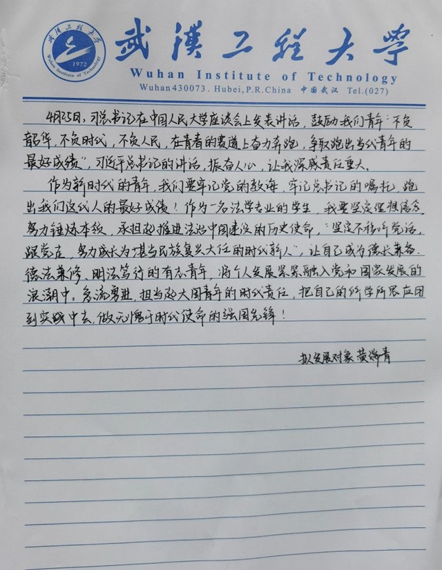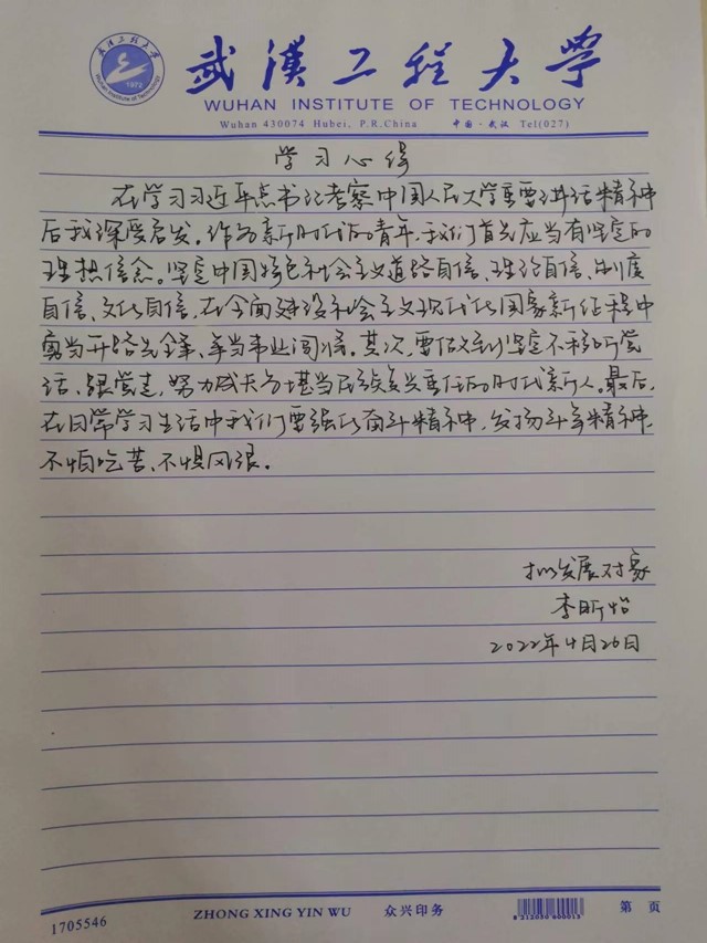 五四青年节将近,习近平总书记在考察人民大学时对青年的问候和嘱托,令我倍受鼓舞。我看到了总书记对青年一代的高度重视和热切期望,我会牢记习近平总书记的教诲,听党话,跟党走,继承优良传统,赓续红色血脉。努力学习科学文化知识,脚踏实地打好根基,用汗水书写青春华章,成长为堪当民族复兴重任的时代新人,在未来能够积极投身于社会发展与国家建设的重要事业中。