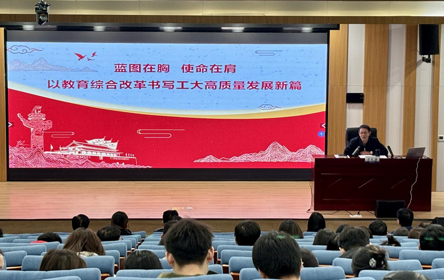 方文海以“蓝图在胸 使命在肩 以教育综合改革谱写工大高质量发展新篇”为题,从深刻认识党的二十届三中全会的重大意义、深刻理解全会提出的进一步全面深化改革重大举措、深刻把握习近平总书记在考察湖北的重要讲话精神、深刻体悟全国教育大会精神四个方面,对党的二十届三中全会精神的丰富内涵和精神实质进行了全面宣讲和深入阐释;从深入贯彻学校教育综合改革的各项部署要求、深入推进各项改革任务落地见效两个方面,提出“教育强国,工大何为?法商何为?”的新命题。