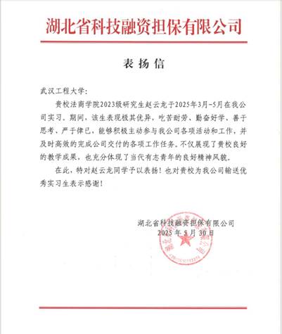 (通讯员 田嘉莉)近日,武汉工程大学收到省级研究生工作站湖北省融资再担保集团下属公司:湖北省科技融资担保有限公司发来的表扬信。该公司在信中对我校金融专业硕士研究生赵云龙同学实习期间的优秀表现给予高度赞扬,同时对学校人才培养工作表示诚挚感谢。